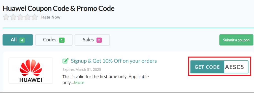 - Browse the available codes and Click on the Huawei Coupon Code that you are interested in.