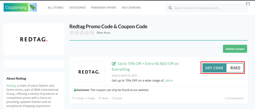 - Go to Couponsey.ae & search Redtag in the search bar.